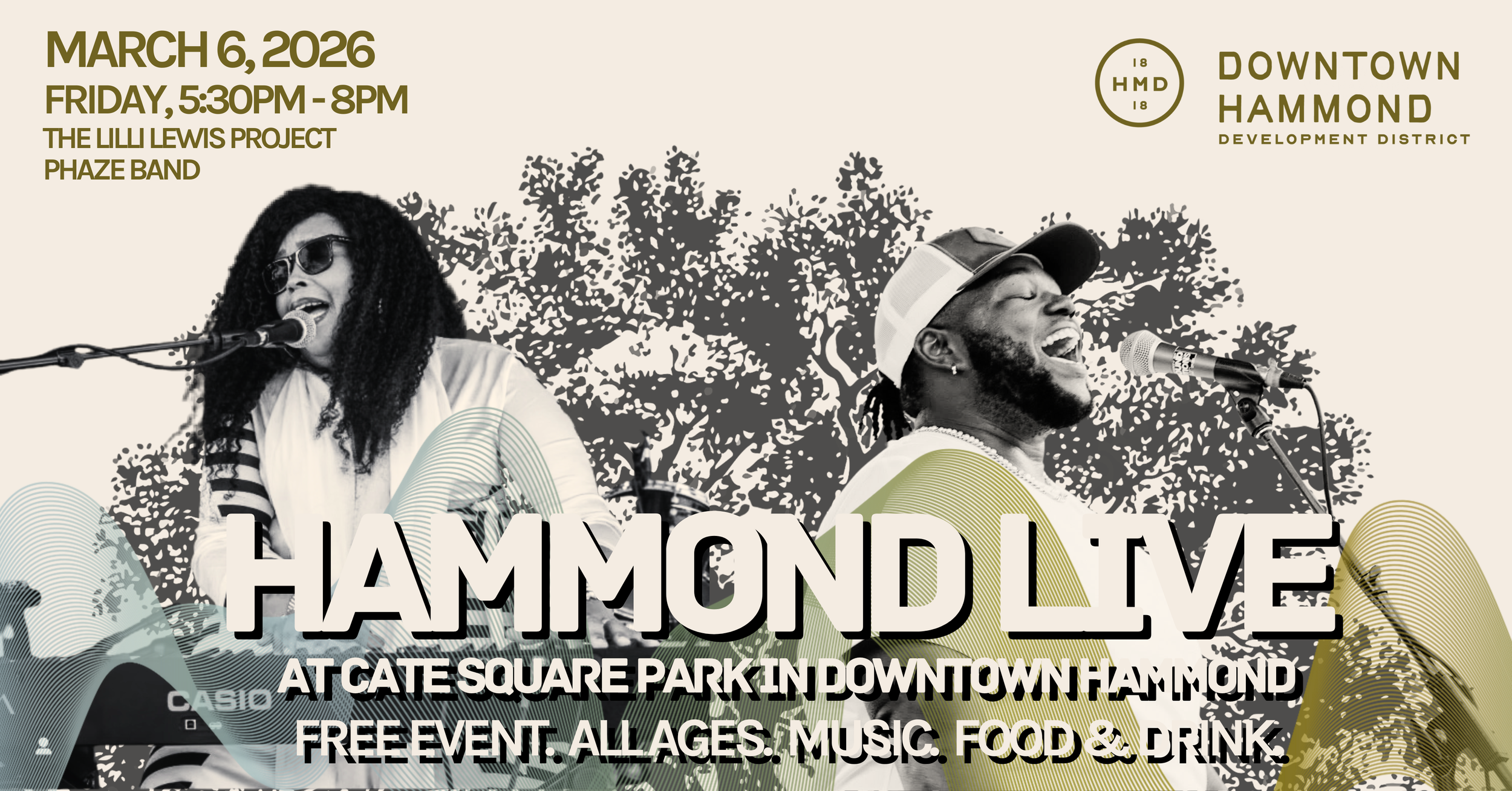 The Downtown Development District is proud to announce the return of its outdoor concert series, Hammond Live—a revival of the Picnic in the Park series that brings live music and community connection to Cate Square Park.