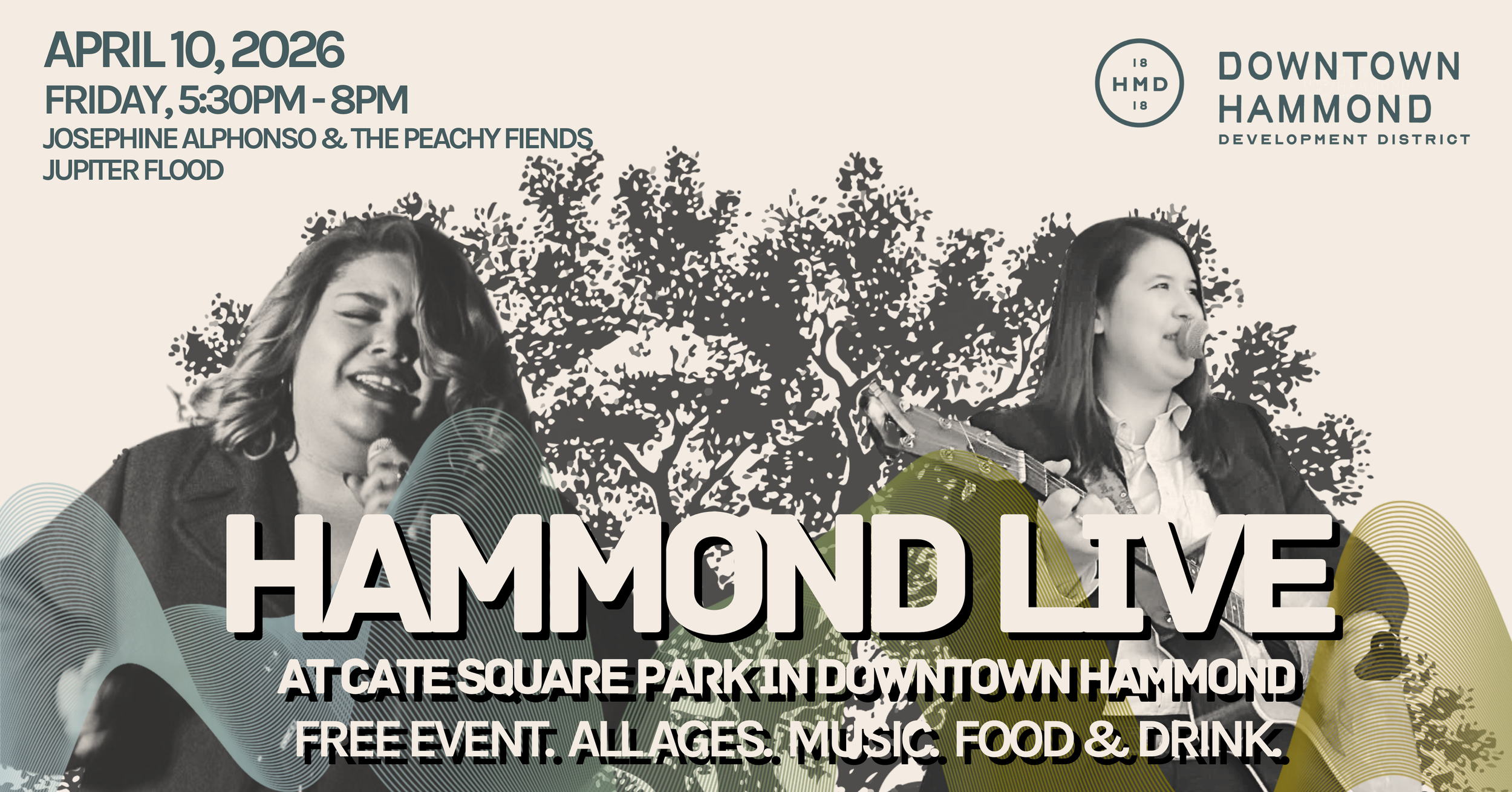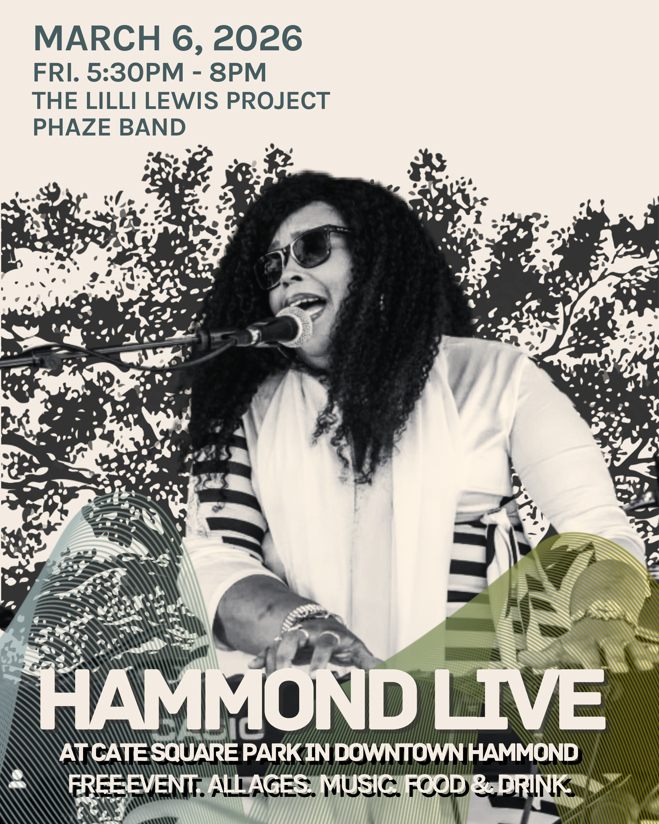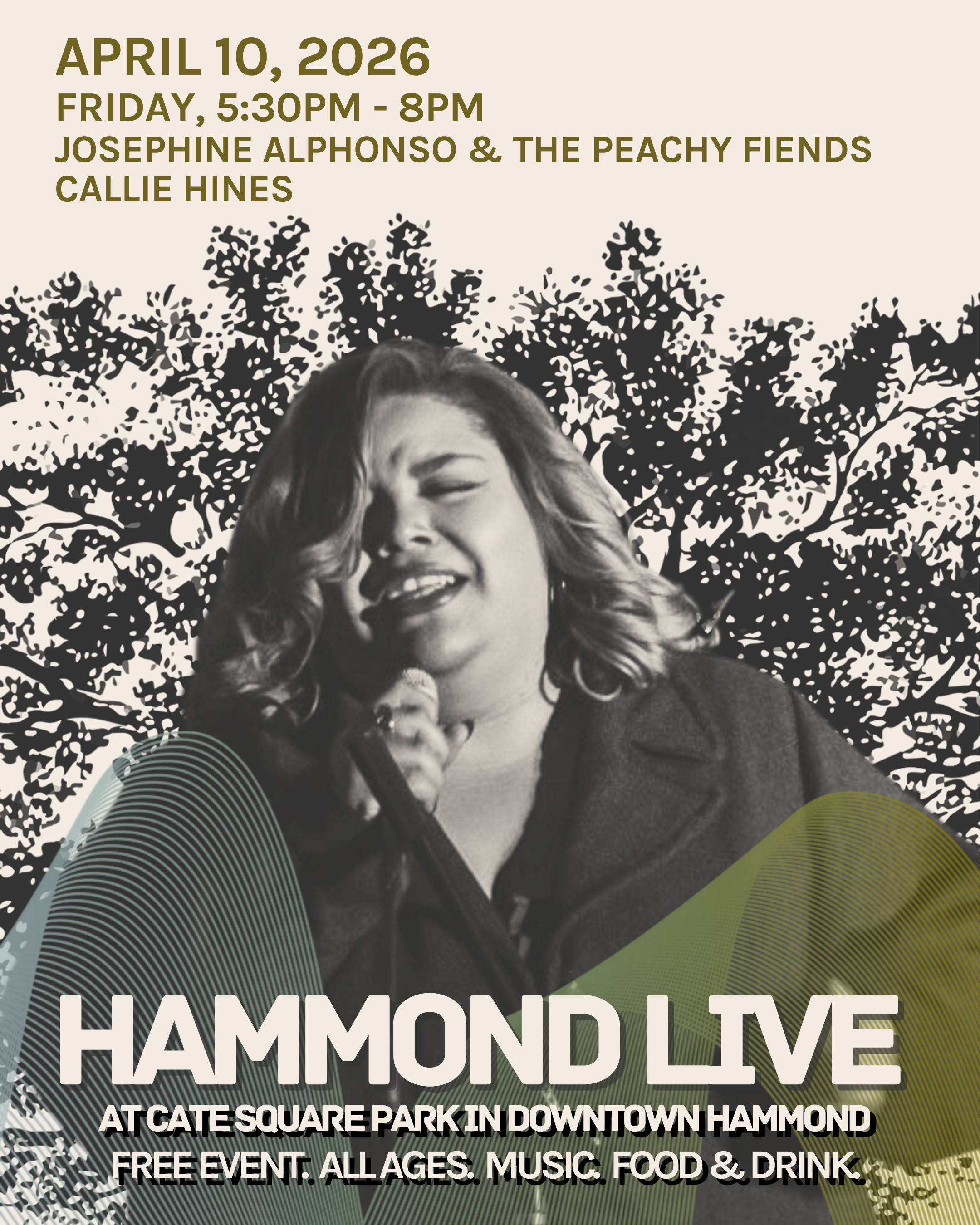Hammond Live is a free outdoor community concert series and open to all ages. Guests are invited to bring lawn chairs or picnic blankets and enjoy an evening of live music under the oaks. Drinks and limited food will be available for sale on-site. Attendees are encouraged to explore Downtown Hammond’s local restaurants for dinner and drinks before, during, or after the show. Portable restrooms will be provided for public use.